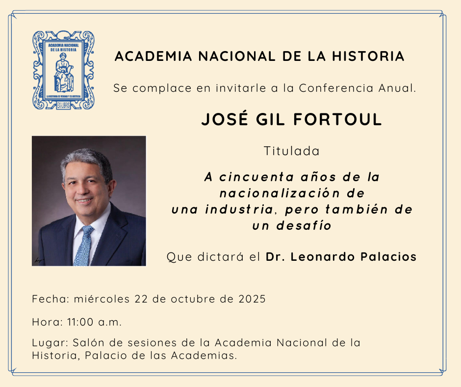 Este año, la Conferencia Gil Fortoul será dictada por el Dr. Leonardo Palacios, bajo el titulo: «A cincuenta años de la nacionalización de una industria, pero también de un desafio«, evento que tendrá lufar el miércoles 22 de octubre de 2025, a las 11:00 am. En el Salón de Sesiones de la Academia Nacional de la Historia.